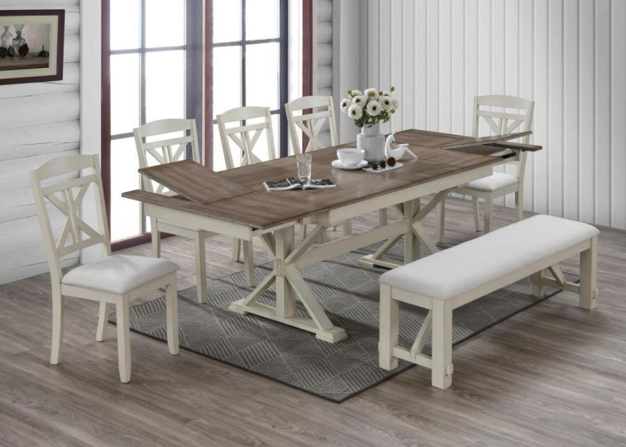 VANGUARD 6PC SET (TABLE, 4 CHAIRS & BENCH) WHITE WASH